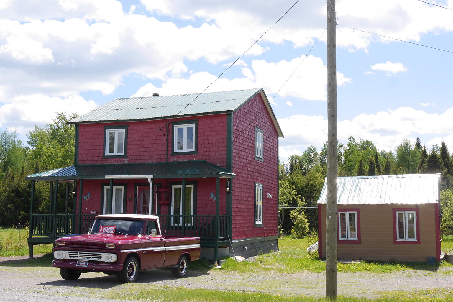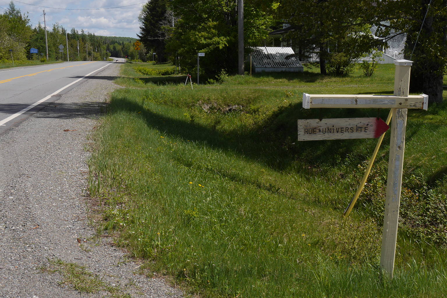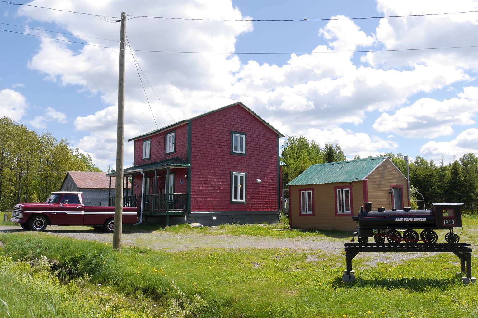 Me voilà sur le site de la légendaire université de Bras-d’Apic. J’ai décidé de m’y arrêter, le temps d’y faire un stage d’une journée, qui n’aura duré en fait que quelques heures, ou même quelques minutes. Aucun autre élève en vue, ni même de personnel enseignant, si ce n’est une nuée de mouches noires qui savait visiblement quoi faire de ma chair fraîchement débarquée de jeune étudiant. .Il semble que le bureau du registraire est fermé aujourd’hui, même chose pour le petit bâtiment qui devait faire office de salle de classe. Je me permets de jeter un coup d’oeil indiscret à l’intérieur: des revues de motoneige, une balayeuse, un calendrier à la poitrine dénudée, deux tasses A&W, une maquette juchée sur une tablette… peut-être une relique de ce qu’avait été l’école de jadis? Je fais un dernier tour de l’endroit, dont la vocation s’est peut-être terminée, le temps de prendre encore quelques clichés… avant de continuer mon chemin vers la prochaine municipalité. Dommage car en m’imprégnant de l’atmosphère paisible des lieux, j’avais commencé à adhérer au principe de l’école buissonnière… aurais-je dû réclamer mon diplôme?